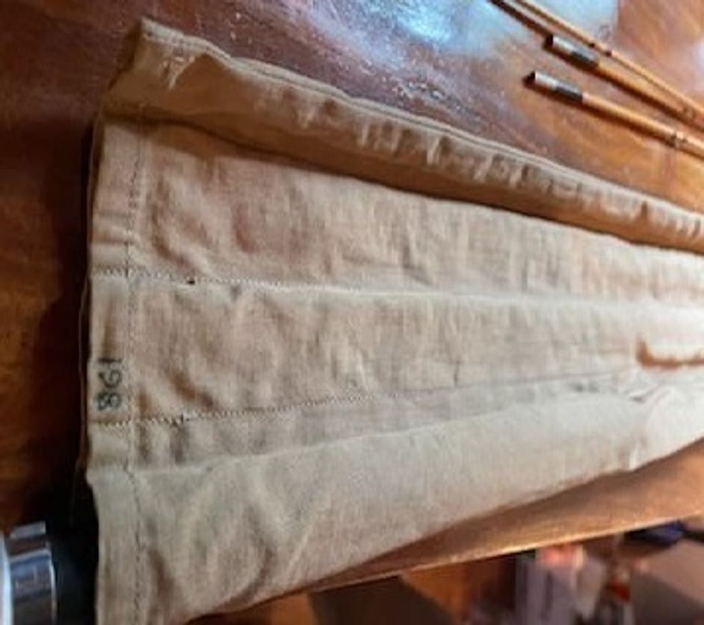 Dickerson bag for an eight foot rod marked "8" on the inside of the flap. Numeric marking for organizational purposes is common on Dickerson's post-war bags and most easily seen on the tan colored bags from the 1950s onward.